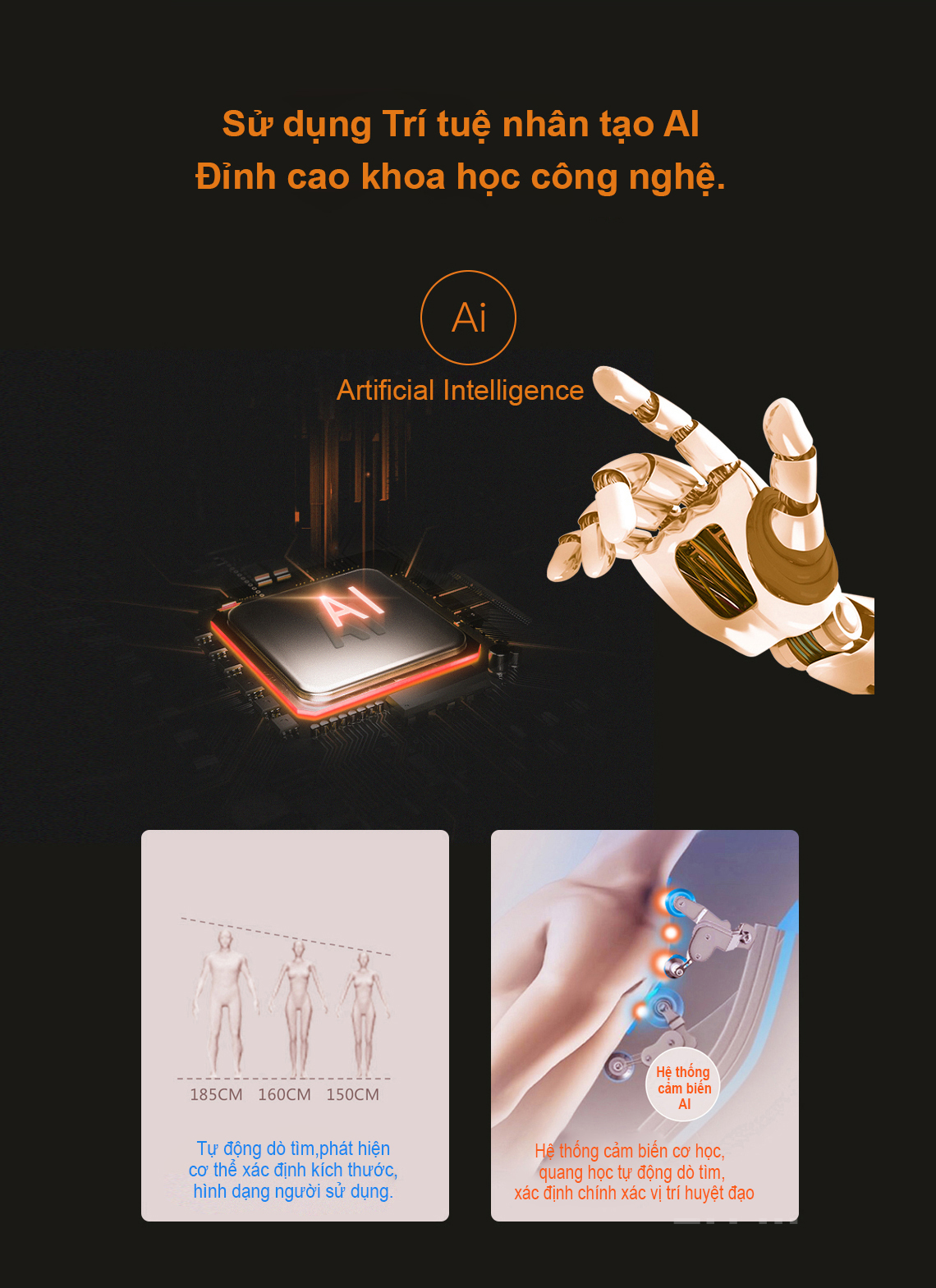 - Hệ thống cảm biến cơ học, quang hoc tự động dò tìm, xác định huyệt đạo; tự động dò tìm, phát hiện cơ thể… phù hợp với hình dạng, kích thước cơ thể của người sử dụng.