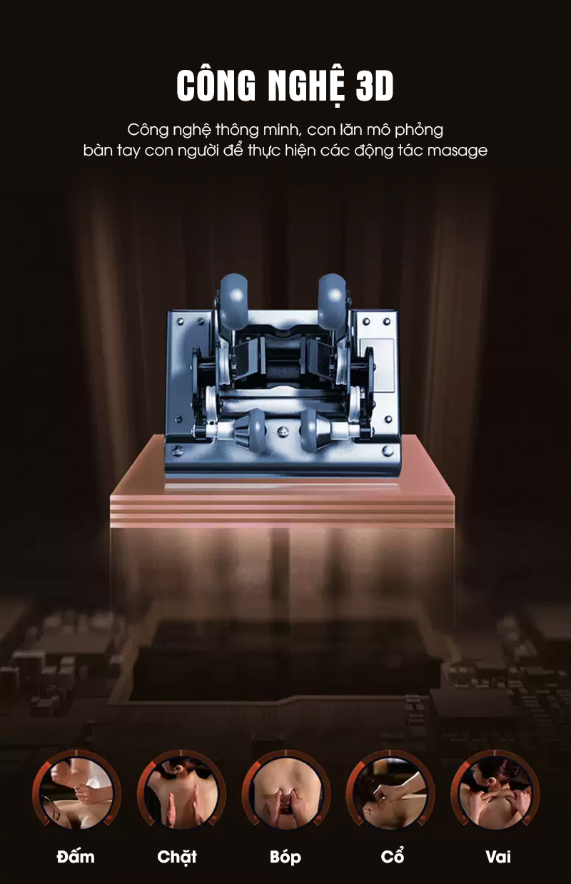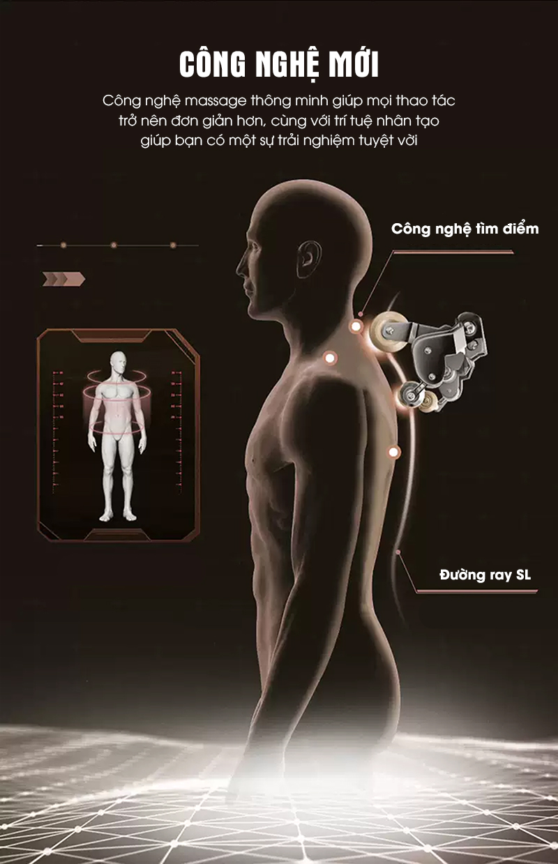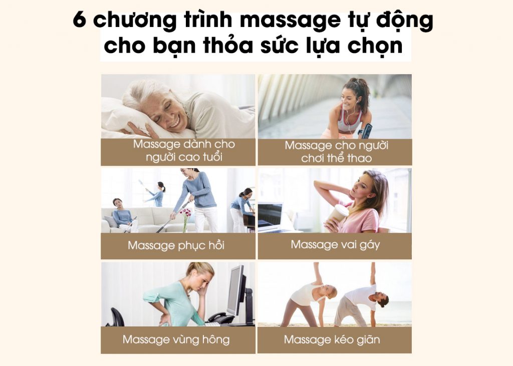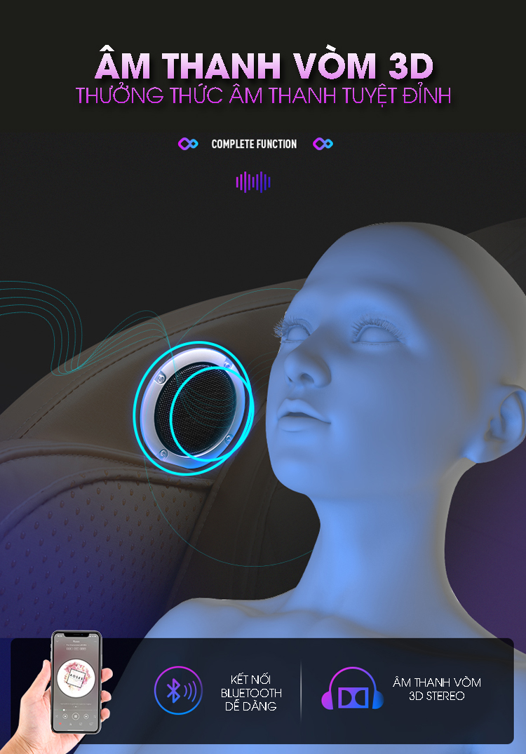 | Chức năng | 6 chương trình massage tự động toàn thân; tự động dò tìm huyệt đạo với hệ thống con lăn quang học; 112 túi khí với 3 mức độ tùy chọn thông minh tác động đến hầu hết các nhóm cơ trên cơ thể; hồng ngoại 4D; nâng dần và hạ dần tựa lưng, chân; massage bàn chân, xoa bóp từ ngoài vào trong, từ trong ra ngoài, vỗ, điều chỉnh lực xoa bóp và lực vỗ, massage khí nén cho bàn chân và mông. |
