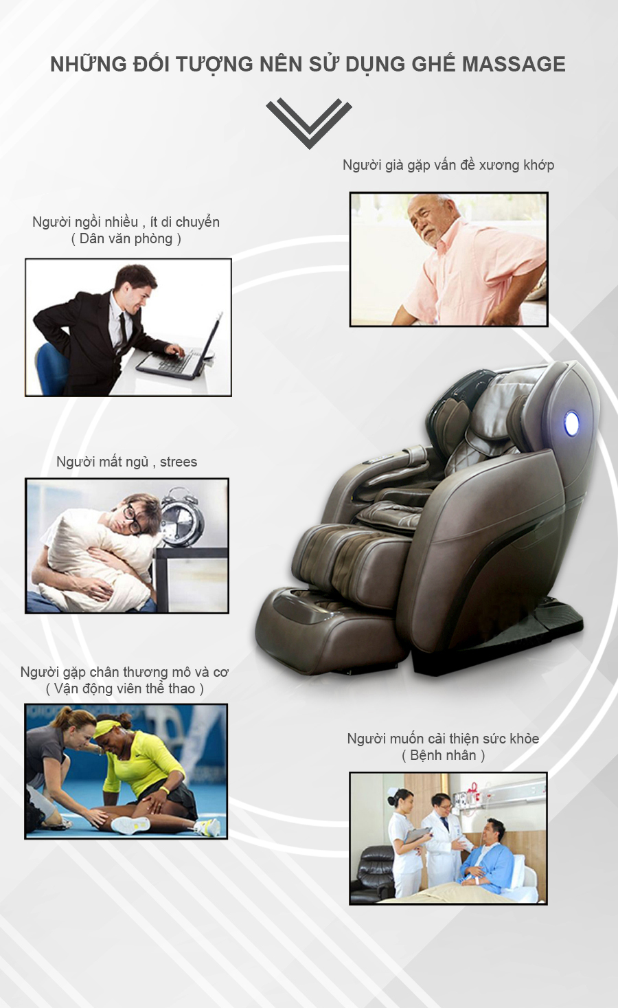 Những người nên sử dụng ghế massage : Bà nội trợ, dân văn phòng, người cao tuổi, vận động viên, người lao động vất vả, bệnh nhân.